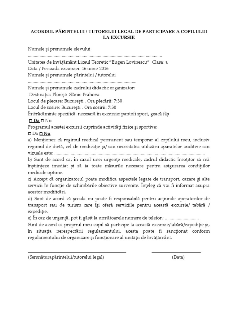 Acordul parintilor pentru excursie. 0 stele 0 review uri. Acordul parintilor pentru a pleca in excursie tabara sau expeditie. 26 februarie 2020 5 martie 2020 by cornel şomâcu. Reluarea în condiții de siguranță a călătoriilor.