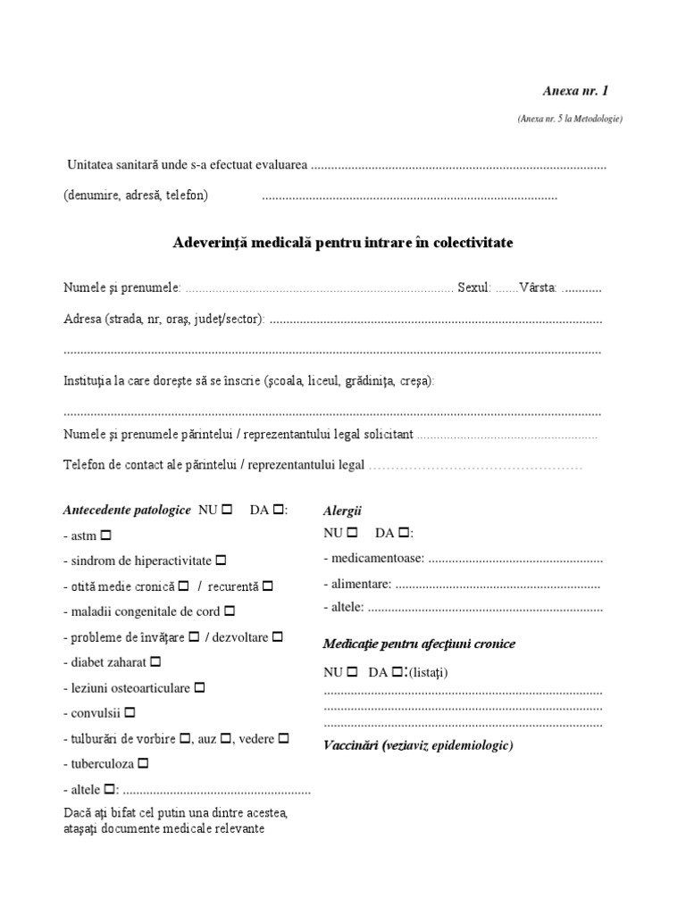Adeverinta medicala pentru intrare in colectivitate. Aviz epidemiologic pentru re intrare in colectivitate poate fi descarcat aici. Codul numeric personal localitatea. A adeverinţă medicală pentru înscrierea în colectivitate conform anexei nr. 1 care face parte integrantă din prezenta anexă.