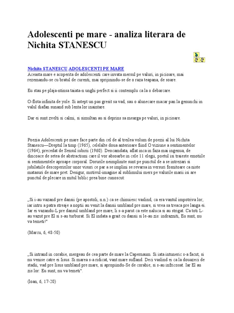 Comentariu adolescenti pe mare de nichita stanescu mai jos o sa aveti mai multe rezultate pentru cautarea comentariu adolescenti pe mare de nichita stanescu. E o calitate pe care oamenii maturi. Versuri nichita stănescu adolescenti pe mare aceasta mare e acoperita de adolescenti care invata mersul pe valuri in picioare mai rezemandu se cu bratul de curenti mai sprijinindu se de o raza teapana de soare. Puteti gasi foarte multe referate accesand categoriile din partea dreapta despre comentariu adolescenti pe mare de nichita stanescu.
