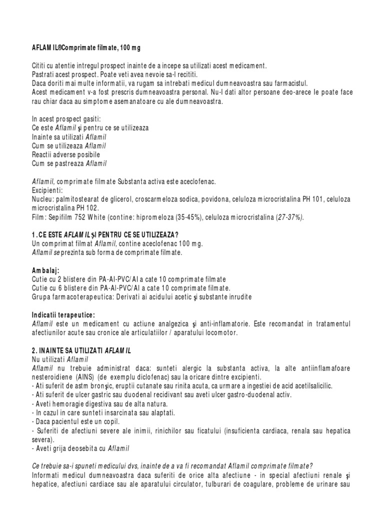 Cum se utilizeaza aflamil. Daca doriti mai multe informatii va rugam sa intrebati medicul dumneavoastra sau farmacistul. Aflamil 100 mg comprimate filmate aceclofenac citiţi cu atenţie şi în întregime acest prospect înainte de a începe să utilizaţi acest medicament deoarece conţine informaţii importante pentru dumneavoastră. Cititi cu atentie intregul prospect inainte de a incepe sa utilizati acest medicament.