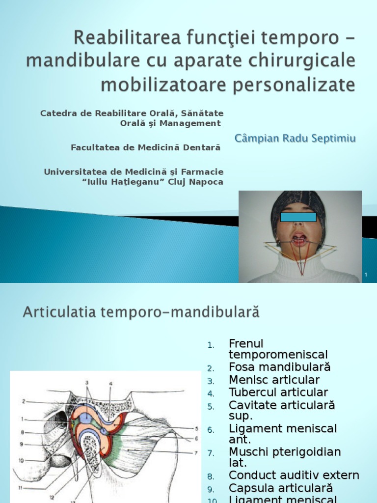 Artrita temporo mandibulara. Artrita temporomandibulară este una din multiplele afecțiuni ale acestor articulații alături de alte disfuncții precum sindromul dureros miofascial deplasarea patologică a discului articular boli congenitale ca hiperplazia condilară hipermobilitatea de la laxitate articulară până la subluxație și dislocație de mandibulă sau hipomobilitatea ex. Articulatiile temporo mandibulare permit maxilarului sa se deschida si sa se inchida pentru ca actiunile de a manca sau vorbi sa fie posibile. Datorită acestei structuri sunt posibile mișcările de mobilizare a gurii în sens vertical și lateral. Debutul tulburarilor atm poate fi acut sau lent insidios cu remisie completa spontana dupa care se pot sau nu croniciza cu durata de luni sau ani de zile.