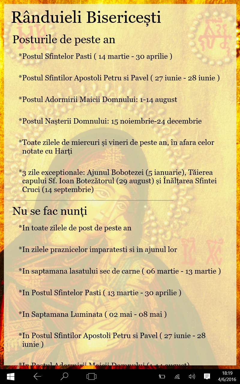 Ian ianuarie zile ziua 10 ore noaptea 14 ore. Ajunul bobotezei 5 ianuarie taierea capului sfantului ioan botezatorul 29 august inaltarea sfintei cruci 14 septembrie postul sfintelor pasti 14 martie 30 aprilie. 4 iunie 17 iunie ziua sfântului duh. Zile de post si posturi calendar ortodox 2016.