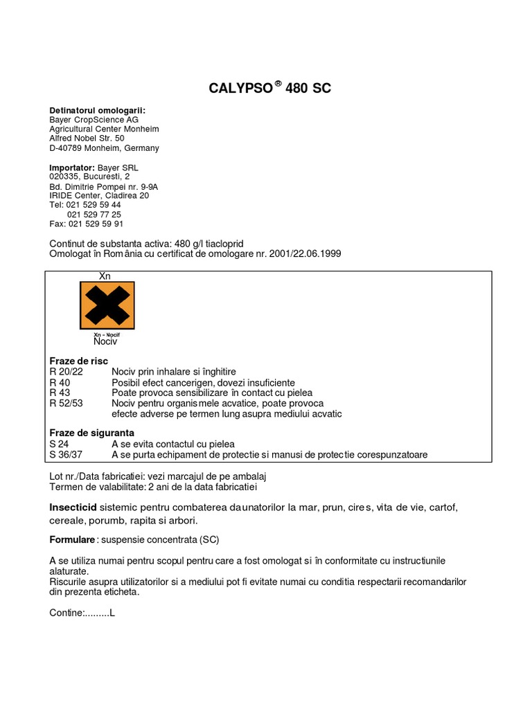 480 g l tiacloprid si o formulare de suspensie concentrata. Insecticid sistemic pentru combaterea dăunătorilor la cartof pomi fructiferi porumb arbori. Important pentru a evita aparitia fenomenului de rezistenta încrucisata calypso 480 sc nu va fi inclus în programele de tratament alaturi de produse avand substante active din aceeasi grupa chimica cloronicotinile. 480 g l tiacloprid si o formulare de suspensie concentrata.
