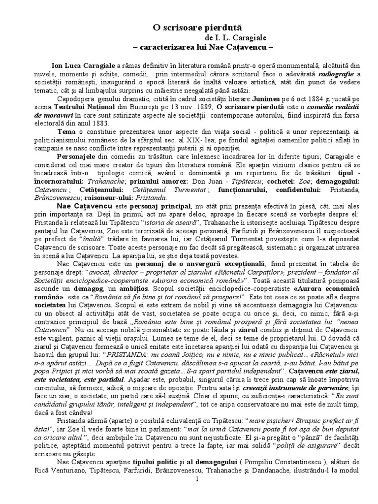 Catavencu o scrisoare pierduta. în stânga la planul al doilea o uşă cu. Zoe nelinistita de disparitia lui se teme in continuare de publicarea scrisorii. O scrisoare pierdută comentariu pe momentele subiectului o scrisoare pierdută apartenenţa la gen o scrisoare pierdută demonstrație că e comedie comentariu o scrisoare pierdută de i l. El foloseşte ca armă politică o scrisorică de amor trimisă de către prefectul judeţului ştefan tipătescu doamnei zoe trahanache soţia venerabilului zaharia trahanache prezident al multor comitete şi comiţii.