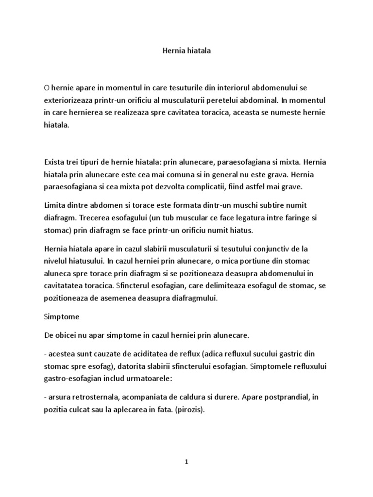 Cauze simptome tratament hernia hiatală de regulă este de mici dimensiuni şi nu are simptome propriu zis supărătoare. In hernia hiatala prin alunecare cel mai frecvent tip jonctiunea gastroesofagian si o portiune a stomacului se afla deasupra diafragmului. Ce este hernia hiatală. In cazurile severe e posibil sa fie nevoie de o interventie chirurgicala pentru tratarea herniei hiatale de mari dimensiuni.